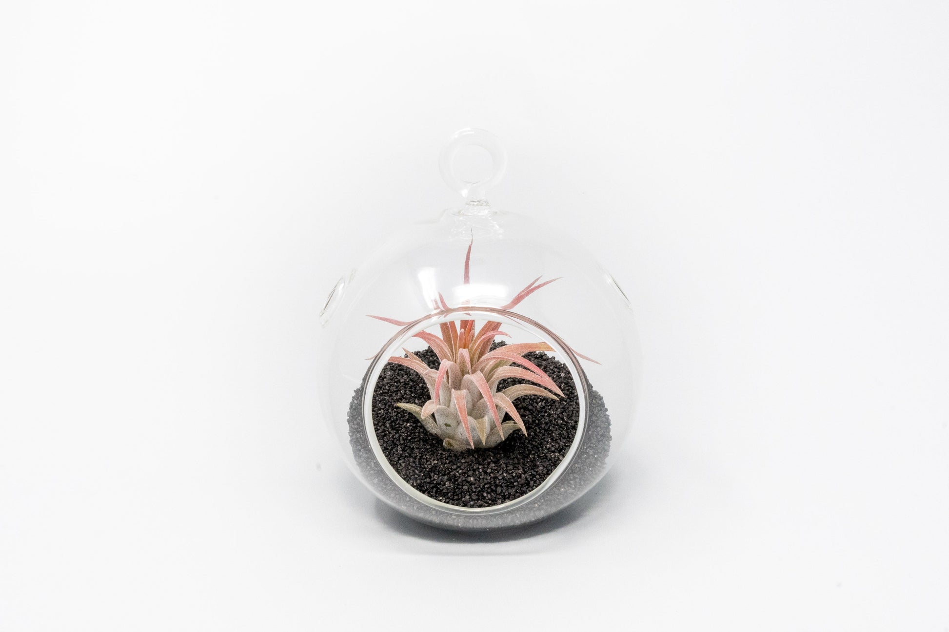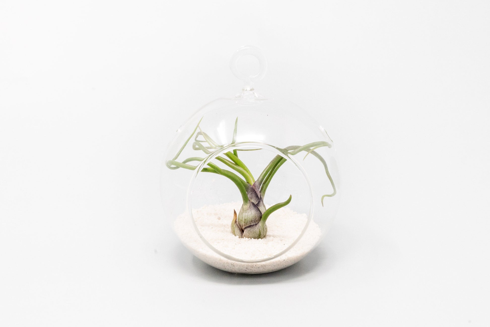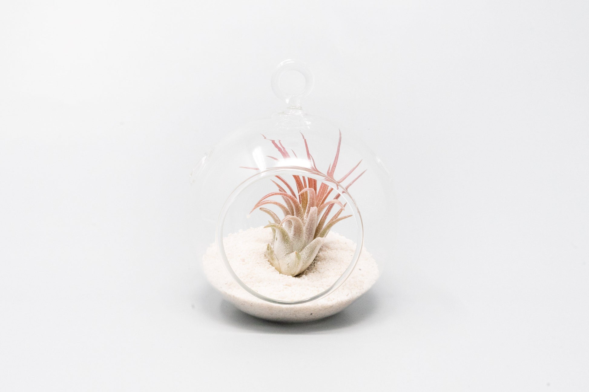 These cute sandy mini flat bottom glass globe terrariums are wonderful gifts, favors, or decorations. The kits include black or white sand and ionantha. Just pour the sand in and place the air plant inside. It is that easy!