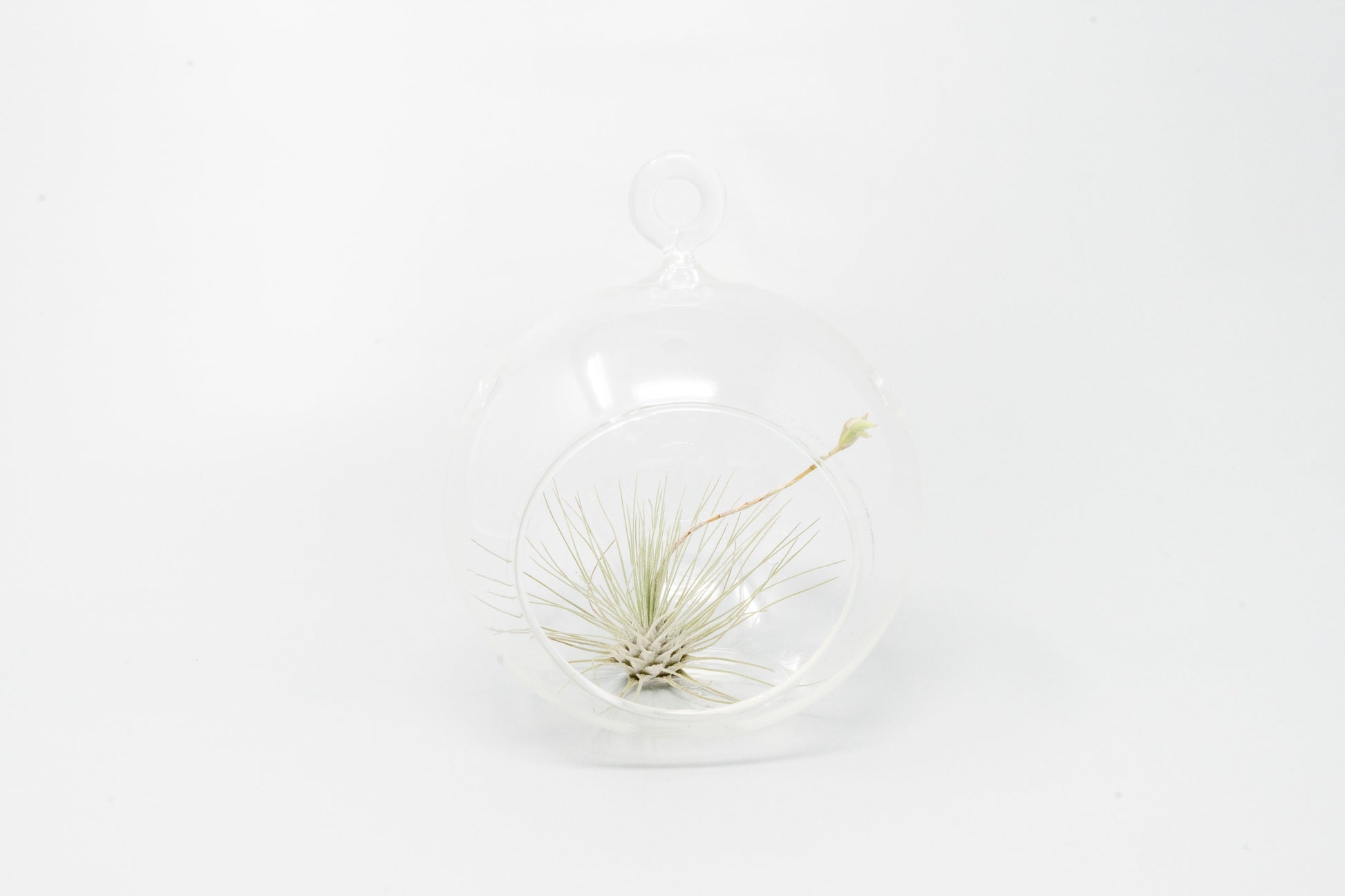 A simple globe terrarium with your choice of air plant. Admire the plant's unique form from all angles of the glass. No dirt required. They have a hook for hanging or you can place them on their flat bottom.